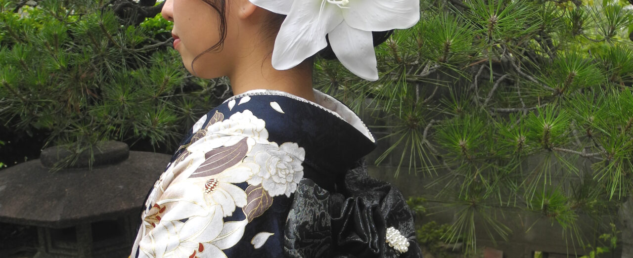 小牧スタジオにて前撮りされた お嬢様のご紹介です。 紺色に白の百合と菊が描かれ... -