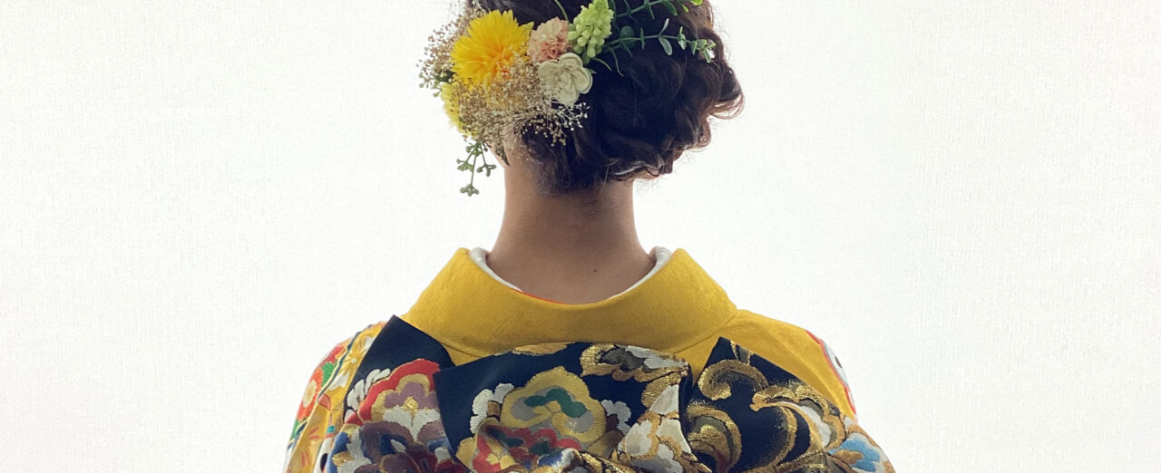 春日井スタジオにて前撮りされたお嬢様。 黄色のお振袖で、 小物は古典系の色で合... -