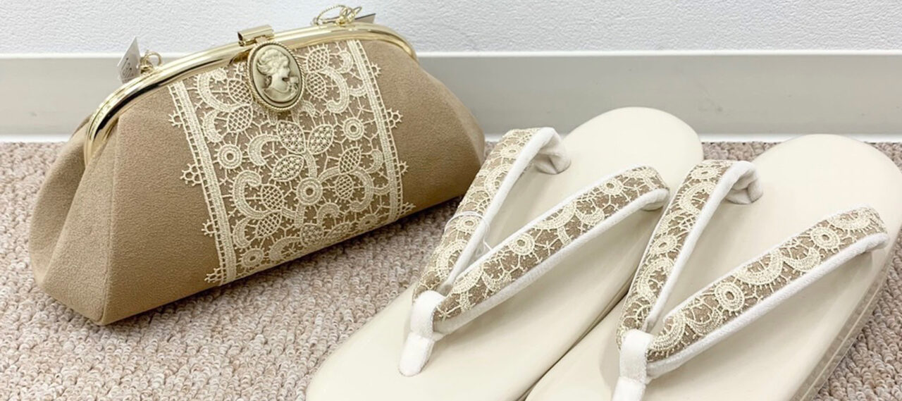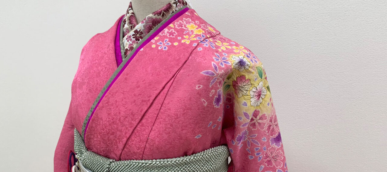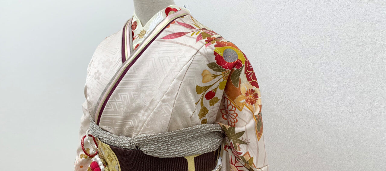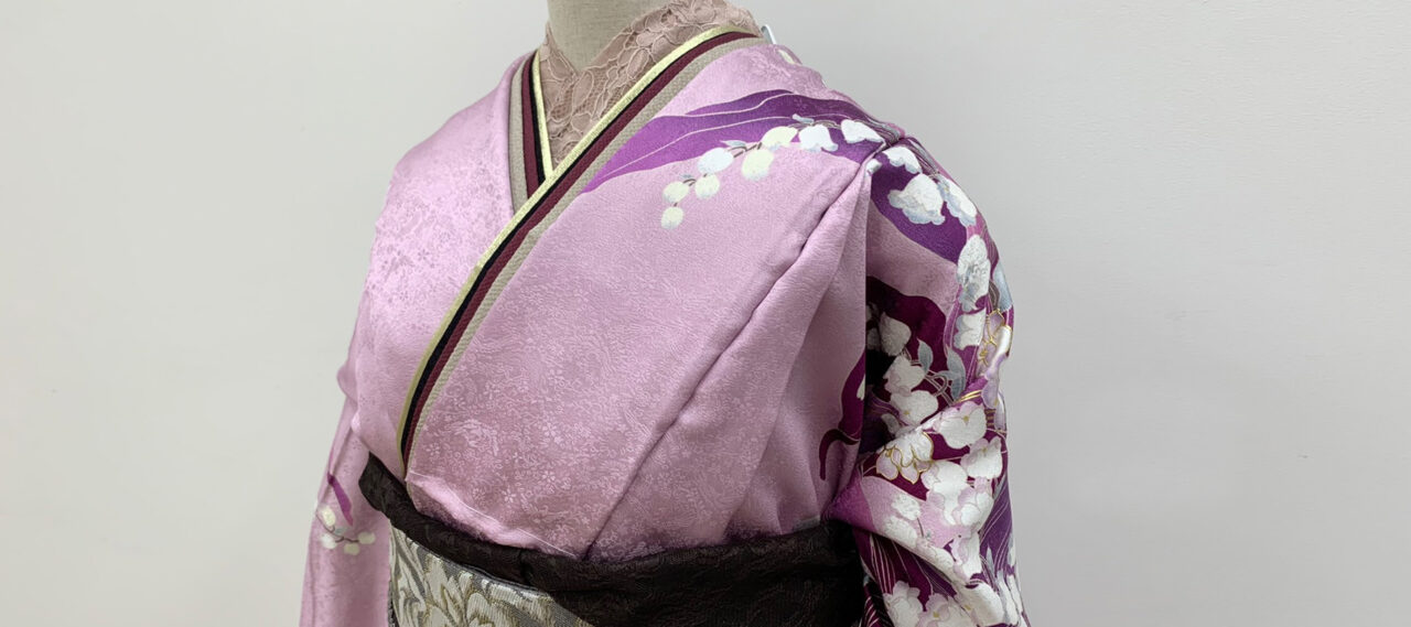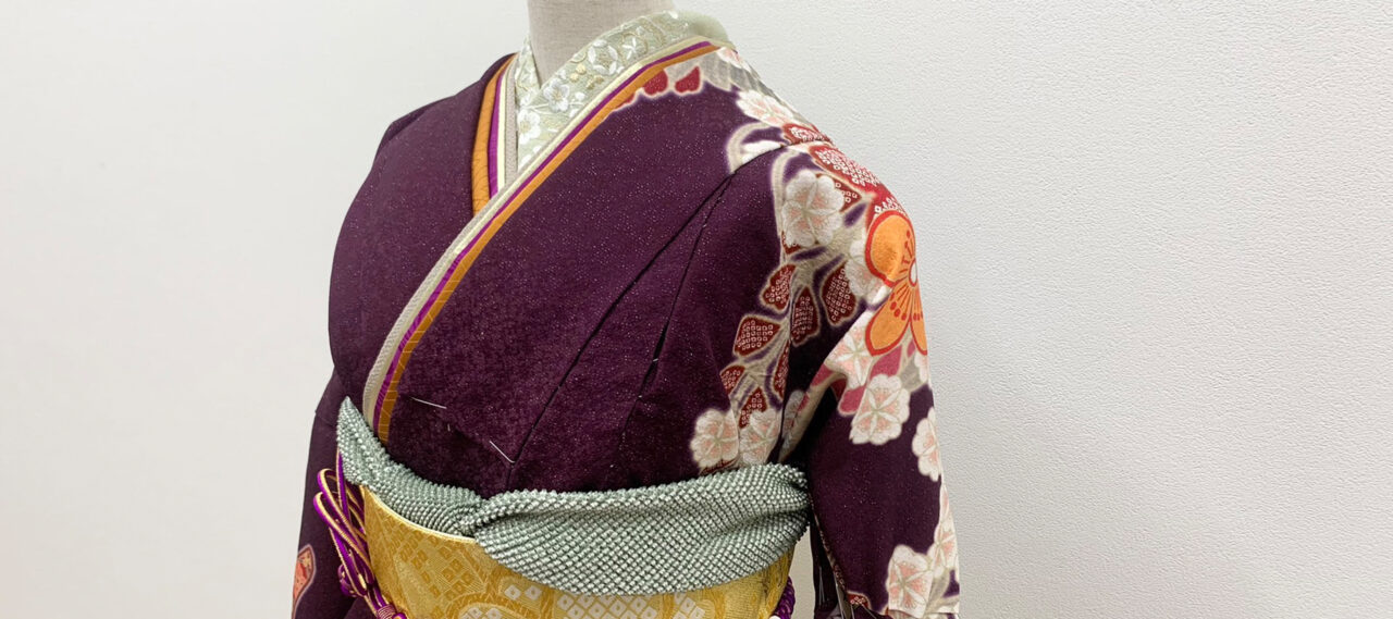 マネキンコーディネートのご紹介。 大きな熨斗(のし)とお花が描かれた紫色のお振袖... -